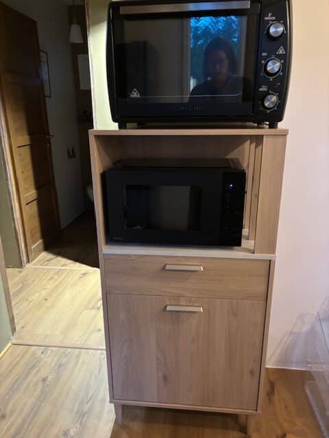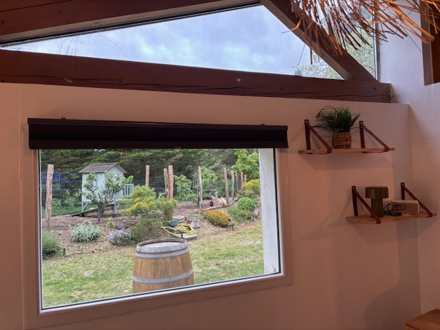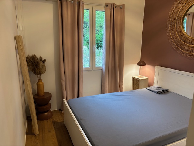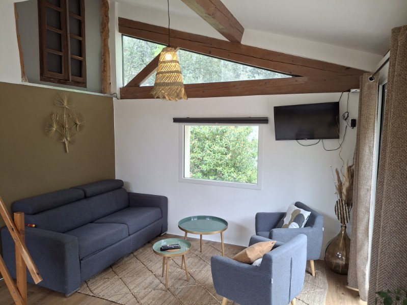 Le gîte, niché dans la forêt, est très lumineux. Il dispose de 2 chambres, dont une mansardée, de la climatisation, d’un coin repas et d’une cuisine entièrement équipée avec un lave-vaisselle.